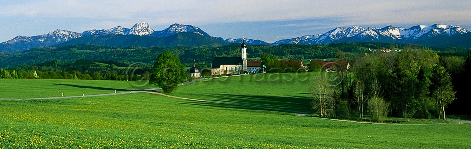 View from Mt. Irschenberg to pilgrim church St. Marin & Anian, Mt. Wendelstein and Mangfall mountains