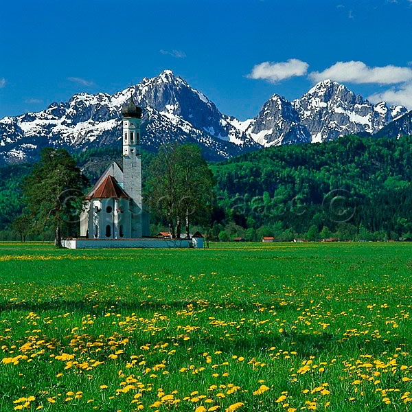 Pilgrimage church St. Coloman against the Allgäuer Alps